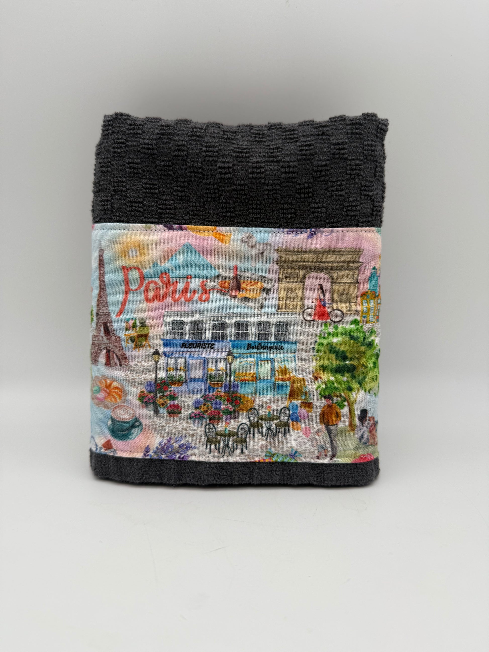 Relive your trip to France with this cute kitchen towel featuring Paris imagery.
