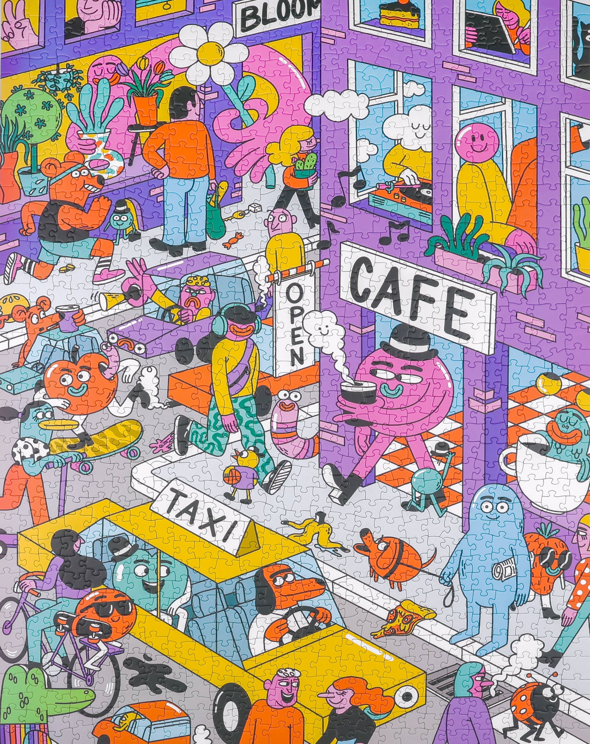 City living at it's finest. German artist Sarah Matuszewski's cityscape is filled with unique characters and busy streets in her colorfully iconic style.