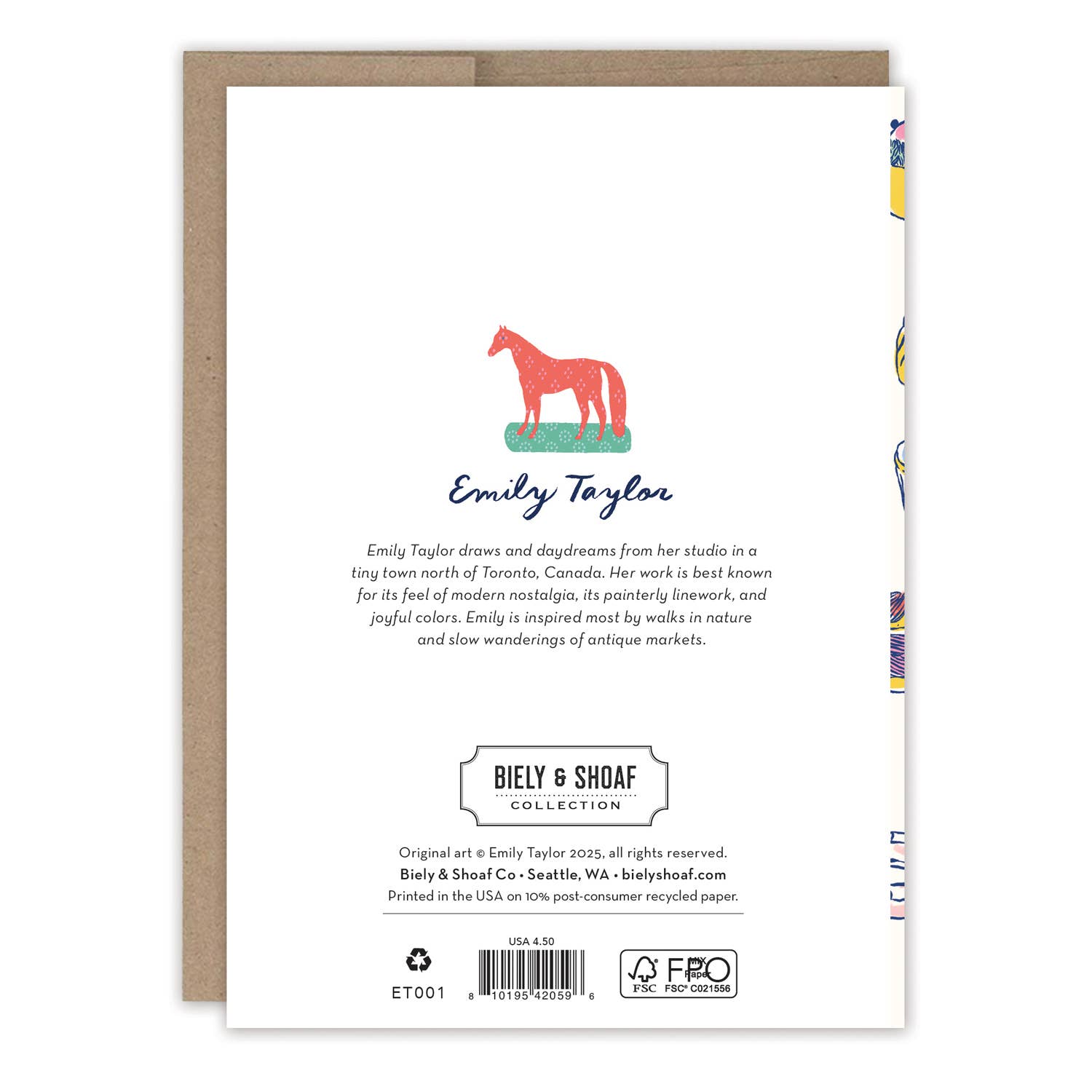 • Illustrated by Emily Taylor, an artist from the Toronto, Canada area. Emily's feel of modern nostalgia, painterly linework and joyful colors are inspired by nature walks and wandering antique markets.
